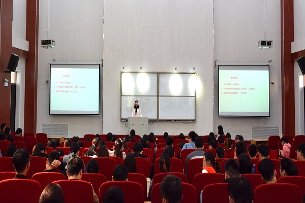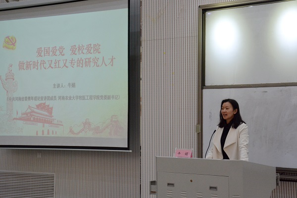 牛娟以《爱国爱党,爱校爱院,做新时代又红又专的研究人才》为题,以党的十九大盛况、党的十九大主题、党的十九大成果为引,从过去五年的成就和变革、习近平新时代中国特色社会主义思想、中国特色社会主义进入新时代、社会主要矛盾表述36年首变、“两个一百年”的奋斗目标等五个方面深入讲解了党的十九大精神的主要内容,她的报告引经据典又结合时事热点,给研究生们呈现出了一个鲜活的党的十九大。