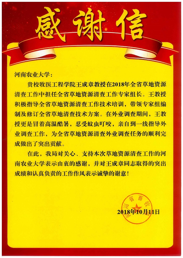 日前,丝袜av 收到来自河南省畜牧局的感谢信,对丝袜av 教师王成章、姜义宝在2018年全省草地资源清查工作中所做的出的贡献表示感谢,对他们严谨求真的科学态度、率先垂范的优良作风、务实严格的工作要求、吃苦耐劳的工作精神给予高度评价。他们的表现也展示了我们牧医人的风采。(文/韩笑)