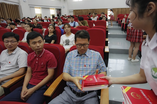 工作人员为全体党员发放《宪法》