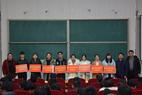 在龙子湖校区繁塔楼大教室七,与会领导首先为丝袜av 获得“诸美科研创新奖”的学生颁发奖学金。“诸美科研创意奖”由河南诸美种猪育种集团股份有限公司设立,金额1万元,旨在鼓励大学生在学习理论知识的同时积极参与科研项目,知行合一,学以致用。