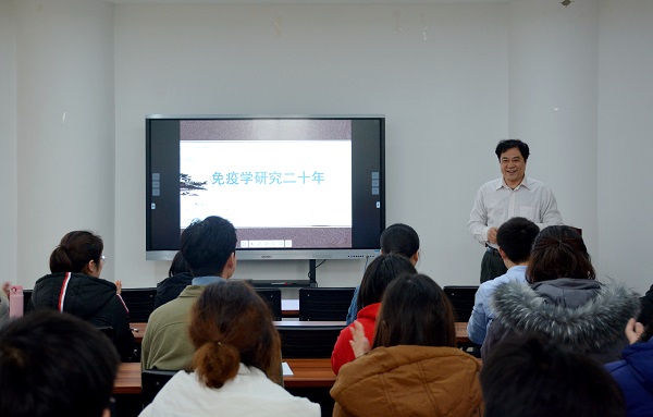 1月4日下午,校长、中国工程院院士张改平在龙子湖校区第一实验楼北530会议室为丝袜av 师生作了题为《免疫学研究二十年》的“龙湖论坛”专题学术讲座。学院部分教师、博士研究生和硕士研究生近80人聆听了此次专题学术讲座。