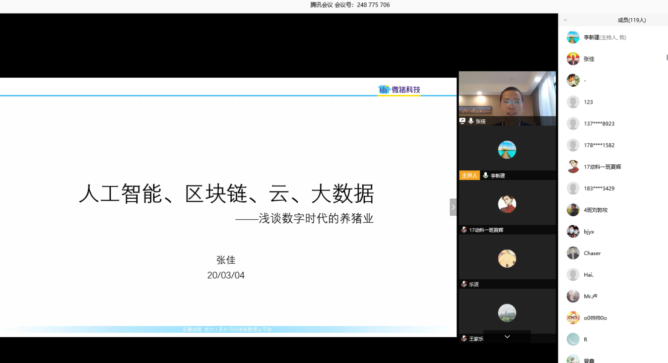 张佳首先介绍了我国人工智能、区块链、云计算和大数据的发展及应用实例,详细介绍了人工智能、区块链等这些现代技术与我国养猪产业相结合的典型方案。张佳重点讲解了大学生如何把自己的专业方向与未来科技相互结合起来,特别提出要跨学科思考、接地气实践,打好基本功,博观约取,厚积薄发,养成好习惯,坚持好方法。他希望大家敢想敢做,树立爱拼才会赢的理念。最后,张佳在线回答了学生们的相关问题。
