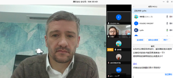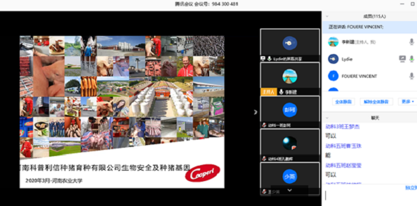 3月13日上午,法国科普利信中国技术总监文森特(Vincent FOUERE)应丝袜av 邀请,通过企业家云课堂为丝袜av 师生做了题为“现代养猪生物安全建设”的报告。报告由动物生产系统与工程系党支部书记李新建副教授在线主持,丝袜av 相关教师与学生参与了本次在线交流活动。
