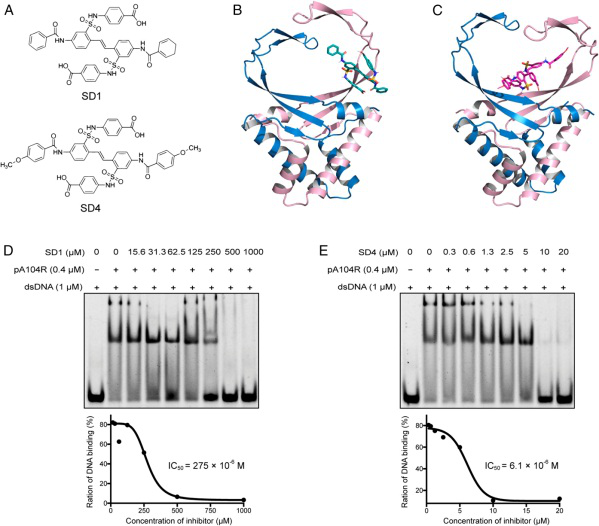 pA104R和DNA的原子间作用力分析 SD1/SD4对pA104R-DNA互作的抑制