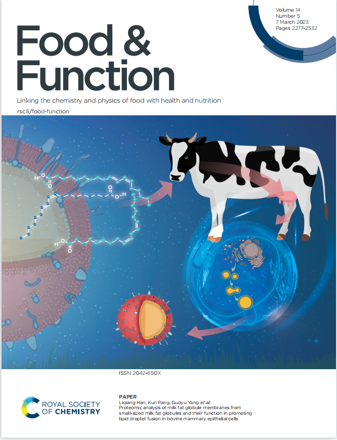 近日,丝袜av 、农业部动物生化与营养重点实验室韩立强、杨国宇教授团队在解析奶牛低乳脂综合症机制方面取得重要进展。研究成果以“Proteomic analysis of milk fat globule membranes from small-sized milk fat globules and their function in promoting lipid droplet fusion in bovine mammary epithelial cells”为题发表在英国皇家化学学会旗下的国际知名学术期刊《Food & Function》(中科院一区,Top期刊)上,并被遴选为封面文章(Outside Front Cover)。韩立强教授为论文第一作者兼通讯作者,杨国宇教授为通讯作者。该研究得到了国家自然科学基金(U1904116)的资助。