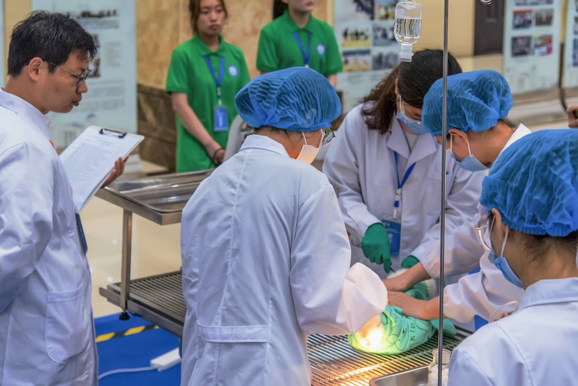 来自四川农业大学和新瑞鹏宠物医院集团等10所院所及企业的专家教授担任评委。共有13个团队近百名同学参赛竞技。大赛分为理论知识竞赛和现场实操竞赛。现场实操竞赛分为兔胃切开术、血涂片制备、徒手打结三个部分。经过激烈角逐,最终评选出特等奖、一等奖、二等奖等团队奖项,以及理论奖、徒手打结奖、血涂片制作判读奖、最佳术者等单项奖。