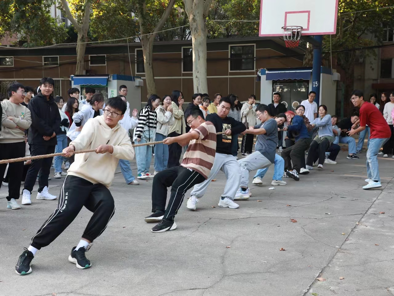 为进一步展现大学生积极向上的精神风貌,增强团结合作精神,提高新生的融入感和校园归属感,10月14日上午,丝袜av 于文化路校区东北角篮球场举办2023级“迎新杯”新生拔河比赛,辅导员冯杰、全体助理班主任和23级全体学生参加比赛。