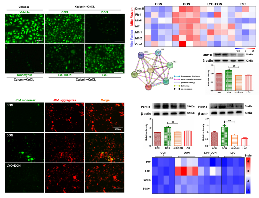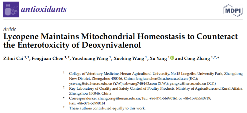 脱氧雪腐镰刀菌烯醇(又名呕吐毒素),是畜禽养殖中最常见、危害最大的真菌毒素之一,主要污染小麦、玉米等谷类作物和动物饲料。呕吐毒素可破坏肠黏膜结构与功能,使肠道屏障受损,危害动物健康的同时降低了生产性能。目前,无法做到霉变饲料中呕吐毒素的完全脱毒,残留的呕吐毒素长时间暴露对动物健康造成了严重问题。课题组前期研究发现线粒体损伤是呕吐毒素致肠损的核心机制。因此,探寻能缓解线粒体损伤的天然药物对于缓解呕吐毒素肠毒性作用和促进畜牧业高质量发展有现实意义。番茄红素是一种被国际公认的食源性营养素,被称之为“植物黄金”,具有抗炎、抗氧化、抗应激、保护线粒体等作用,并可增加了肠道紧密连接蛋白表达、改善了肠道屏障完整性。本课题围绕番茄红素是否能够抵抗线粒体损伤、调控线粒体自噬、维持线粒体稳态缓解呕吐毒素肠毒性这一科学问题开展了进一步研究。