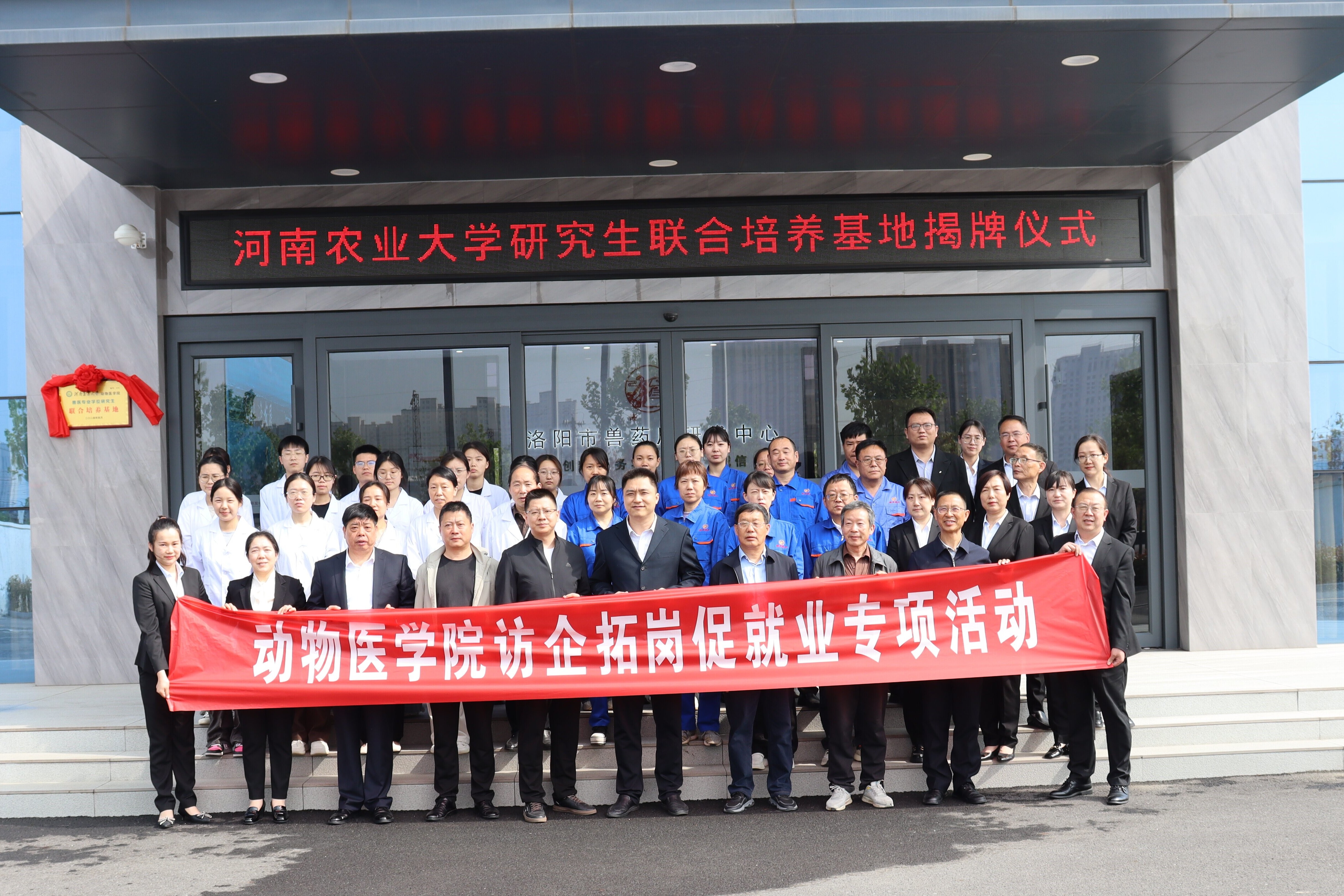 韩立强与洛阳市兽药厂负责人魏迎军签订了本科生校外实践教学基地、兽医专业学位研究生联合培养基地的共建协议,并进行授牌。