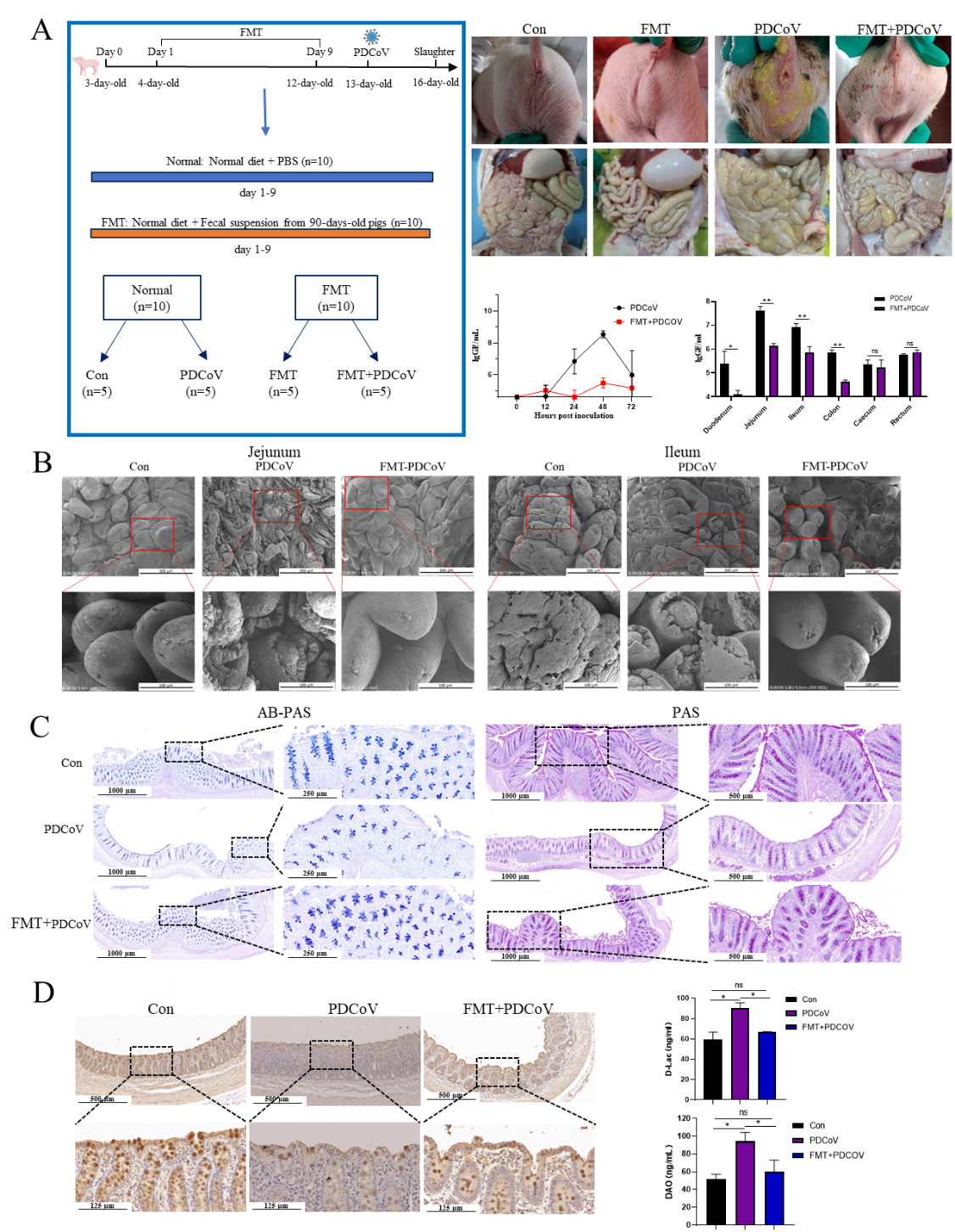 图2:粪菌移植可维持仔猪肠道屏障缓解PDCoV感染引起的肠道损伤