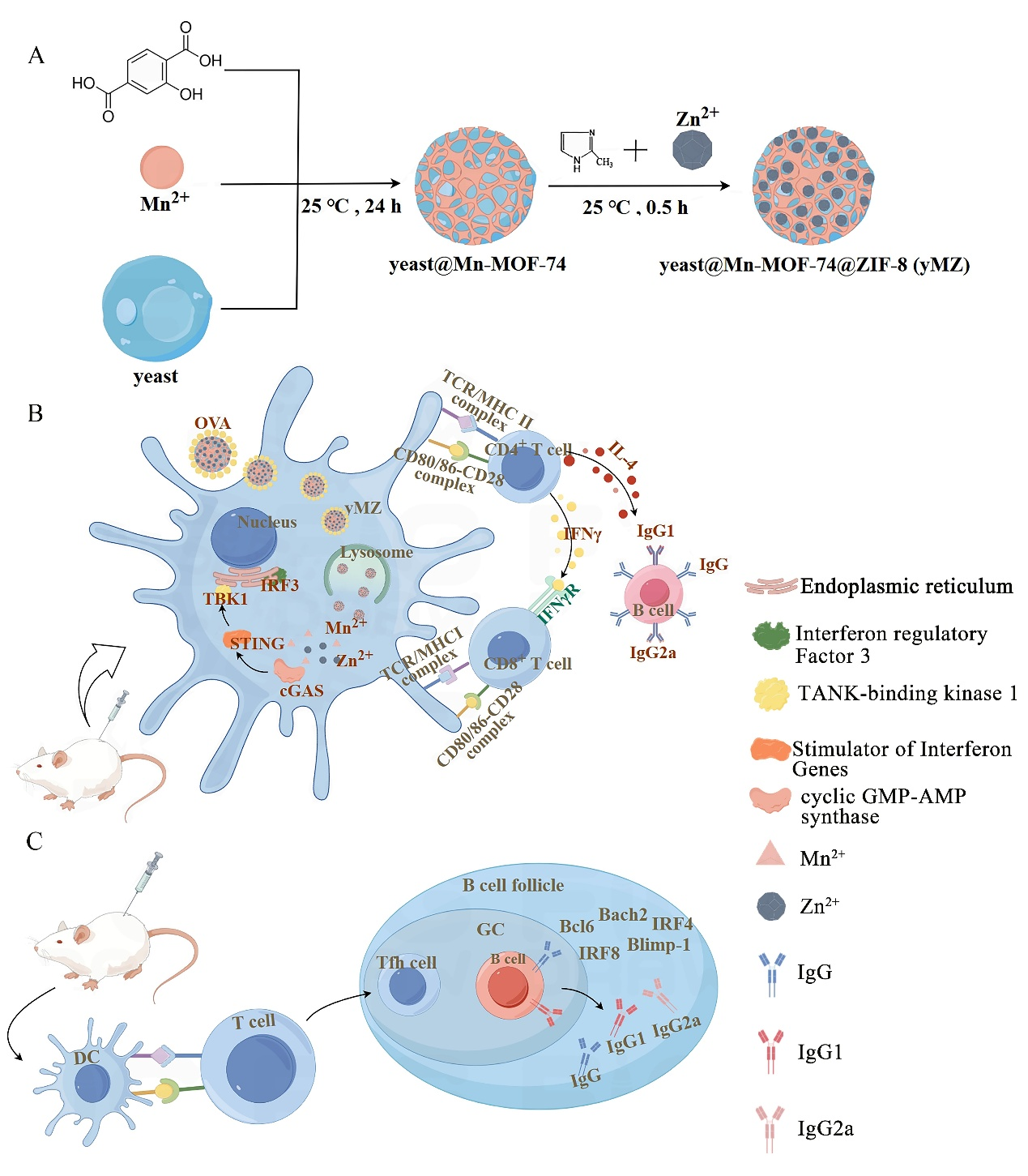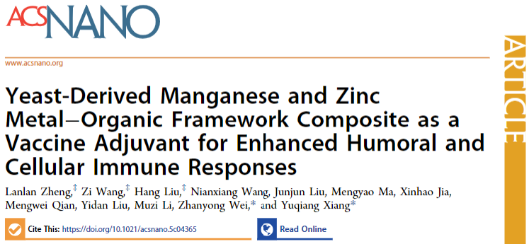 疫苗佐剂是增强疫苗免疫效果的关键组分,传统佐剂虽广泛应用,但存在效率有限、潜在副作用、不适合冻干或冷冻储存等问题。由于佐剂设计机制复杂,目前临床批准的佐剂种类较少,远不能满足疫苗研发需求。针对这一挑战,丝袜av 魏战勇教授团队提出新的解决方案:以酿酒酵母菌的菌体为模板,通过生物矿化在其表面逐层自组装锰基MOF(Mn-MOF-74)和锌基MOF(ZIF-8),构建新型复合佐剂yMZ(图1)。该技术突破三大难题:①组分协同增效:酵母细胞壁的甘露聚糖、β-葡聚糖与双金属MOF协同作用,激活cGAS-STING天然免疫通路,实现“1+1+1>3”的免疫增强;②安全性提升:MOF包覆减少金属纳米颗粒用量,避免毒副作用;③稳定性优化:克服传统纳米颗粒易团聚问题,适配冻干工艺,无需乳化,与抗原混匀后即可使用。