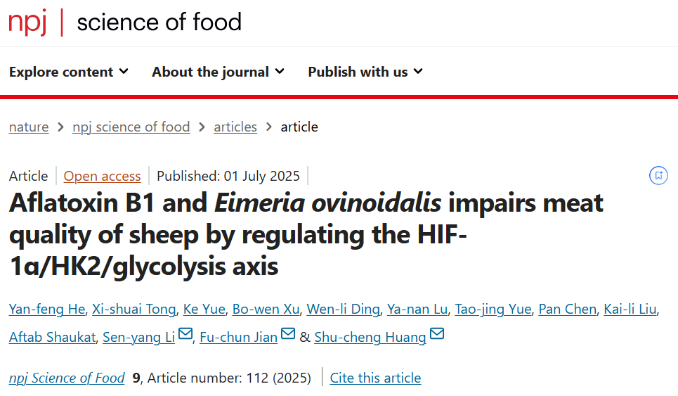 团队通过两周的动物试验发现,AFB1 与类绵羊艾美耳球虫联合可导致羊肉 pH 值异常、肉色苍白、持水能力下降及嫩度降低,肌肉纤维结构出现明显间隙与损伤,从而改变羊肉肉质物理特性;电子鼻分析显示羊肉中烷烃、含硫化合物等风味成分显著减少,引发风味物质失衡。基于以上羊肉品质的变化,进一步通过羊肉代谢组学和转录组学分析,揭示了AFB1和类绵羊艾美耳球虫损害肉质的潜在机制,证实了糖酵解在肉质变化中的关键作用。研究发现AFB1 与球虫通过激活肌肉组织中的 HIF-1α 信号通路,上调糖酵解关键酶 HK2 的表达,可能加速葡萄糖代谢,导致乳酸积累失衡与肉质酸化异常。分子对接实验进一步证实,AFB1 及其代谢物与 HK2 具有强结合亲和力,参与干扰糖酵解过程,从而引发羊肉肉品质指标的异常。该项研究首次以反刍动物为模型揭示了AFB1与EO协同作用损害羊肉品质的潜在毒害机制,建立两者通过“氧化应激-炎症-糖酵解”轴调控肉质的理论框架,为养殖业中球虫病的综合防控和霉菌毒素污染的风险管理提供科学依据。