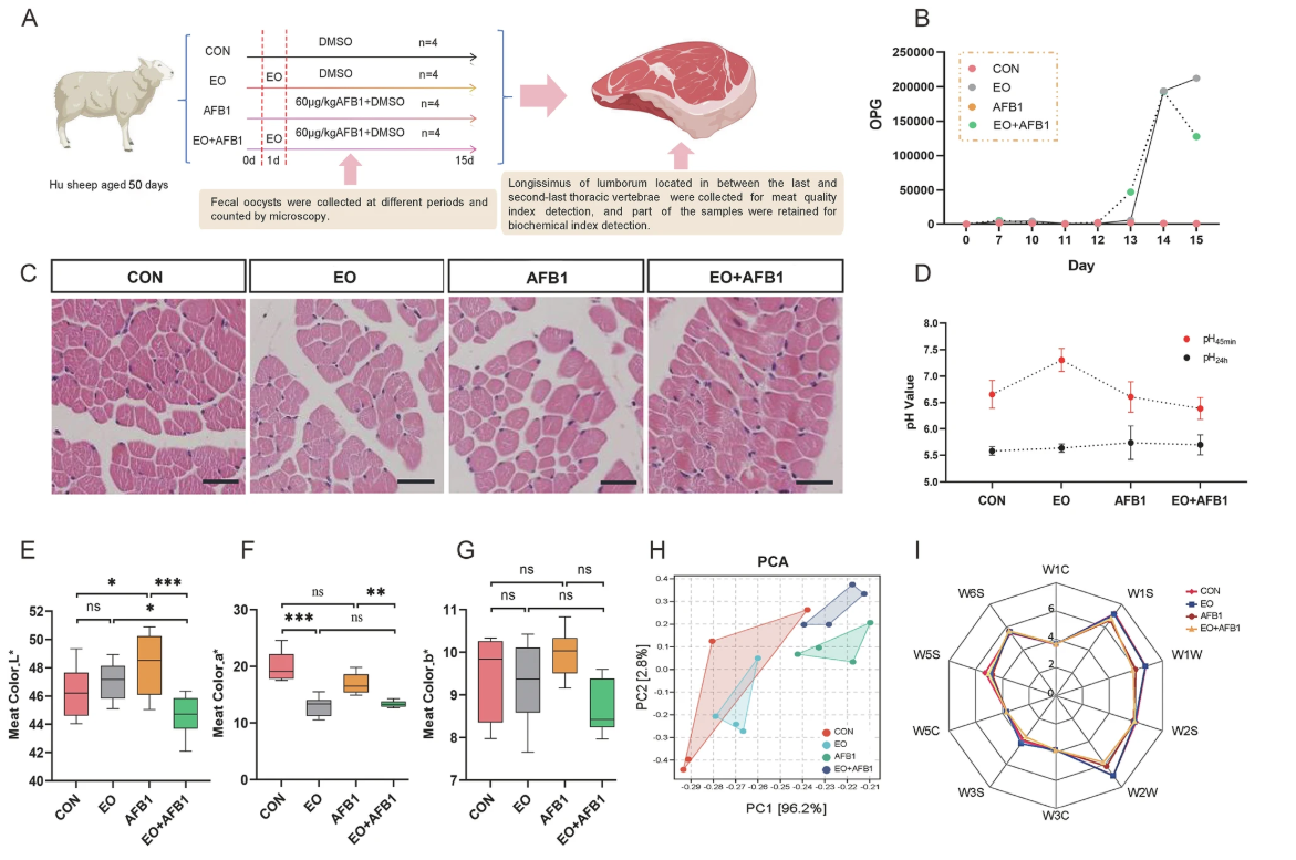 羊肉因其高蛋白、低脂肪的营养特性和独特风味深受消费者青睐,已成为全球约70%人群日常饮食的重要组成部分,但绵羊养殖过程中常面临饲料霉变与寄生虫感染的双重威胁。AFB1 作为毒性最强的真菌毒素之一,广泛存在于霉变饲料中;而类绵羊艾美耳球虫则是导致绵羊球虫病主要病原,二者在实际生产中常共同存在,但其对绵羊肉质的联合影响机制仍不清楚。