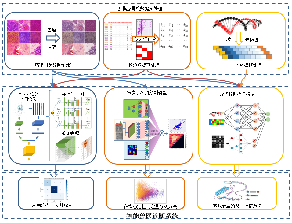 智能兽医实验室的研究主要涉及畜禽重大疫病智能病原病理分析与诊断系统开发、寄生虫数据管理平台的建立等方面。实验室围绕仔猪传染性腹泻高发且致死率高的问题,提出了一种新型的基于病理图像的幅度-相位混合语义神经网络(APHNet),用于通过病理图像对猪流行性腹泻病毒(PEDV)进行分类,聚焦于提升不同病毒毒株的智能识别效率。实验室还研发了融合CoT与NAM模块的YOLO-GA模型,显著提升了复杂背景下羊球虫等寄生虫虫卵或卵囊的检测精度,解决传统方法对小目标和重叠目标识别困难的问题,构建了高效、轻量的图像智能检测系统,助力寄生虫病高通量筛查。同时,实验室构建寄生虫数据管理平台,实现图像分类、存储与智能分析一体化管理。另外,实验室分别构建了200万图像样本级别和10万图文对照样本两个大模型,为病毒、寄生虫等目标分割、检测、分类、预测等认为提供了基础模型。目前基于开发的寄生虫图文生成大模型,开发了可自动生成寄生虫相关研究报告与科普内容的系统,推动兽医知识传播智能化,强化信息与兽医深度融合的交叉创新优势。