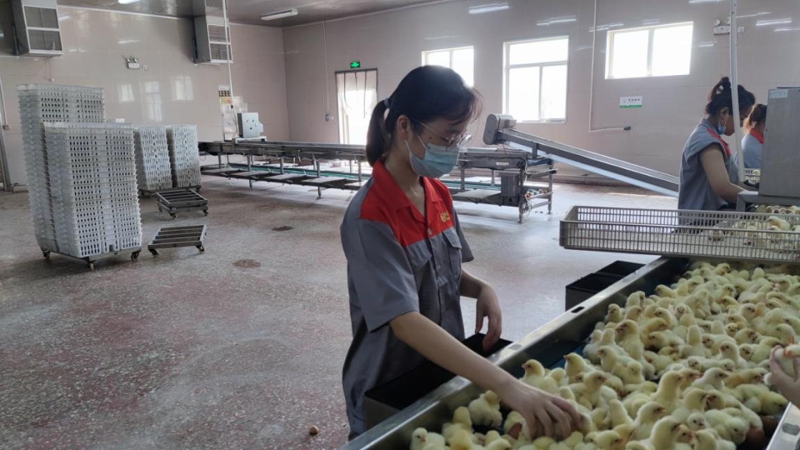 在实践开始前,实践队员们来到孵化场,对孵化场进行了参观和学习,在这里,他们了解到孵化产业的核心工作是打造4A级雏鸡并且这里的每日出雏鸡数量在十万上下。据工作人员介绍:种蛋的管理期是指从种蛋产出到入孵的时间段,一般在0-7天范围内。种蛋管理期分为三个阶段,第一阶段是种鸡场,第二阶段是运输,第三阶段是孵化场。种蛋管理期以“种蛋大小一致”为目标,保持受精率、蛋重不变,并且挑选出合格的雏鸡。实践队员细心学习并且了解到优质鸡苗外在质量方面应具备的条件为:鸡苗应来自种蛋50~65g或52~68g且大小均匀整齐;手感有力,叫声响亮,精神十分警觉,卵黄吸收良好,脐孔愈合完全;脚干饱满,光华亮丽不干燥,若脚干皮肤起皱,表示雏鸡已经脱水。实践队员们在观察了一会孵化场工人的工作流程后对如何挑选合格雏鸡的步骤已经十分清楚了,就开始在流水线上参与挑选雏鸡的工作了。