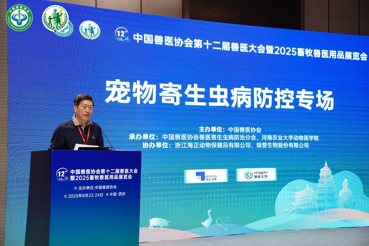 中国兽医协会监事长汪明教授代表中国兽医协会致辞,他指出随着宠物行业快速发展,寄生虫病不仅威胁宠物健康,更存在人兽共患病传播风险,加强兽医寄生虫病防治是保障公共卫生安全与行业高质量发展的重要举措。