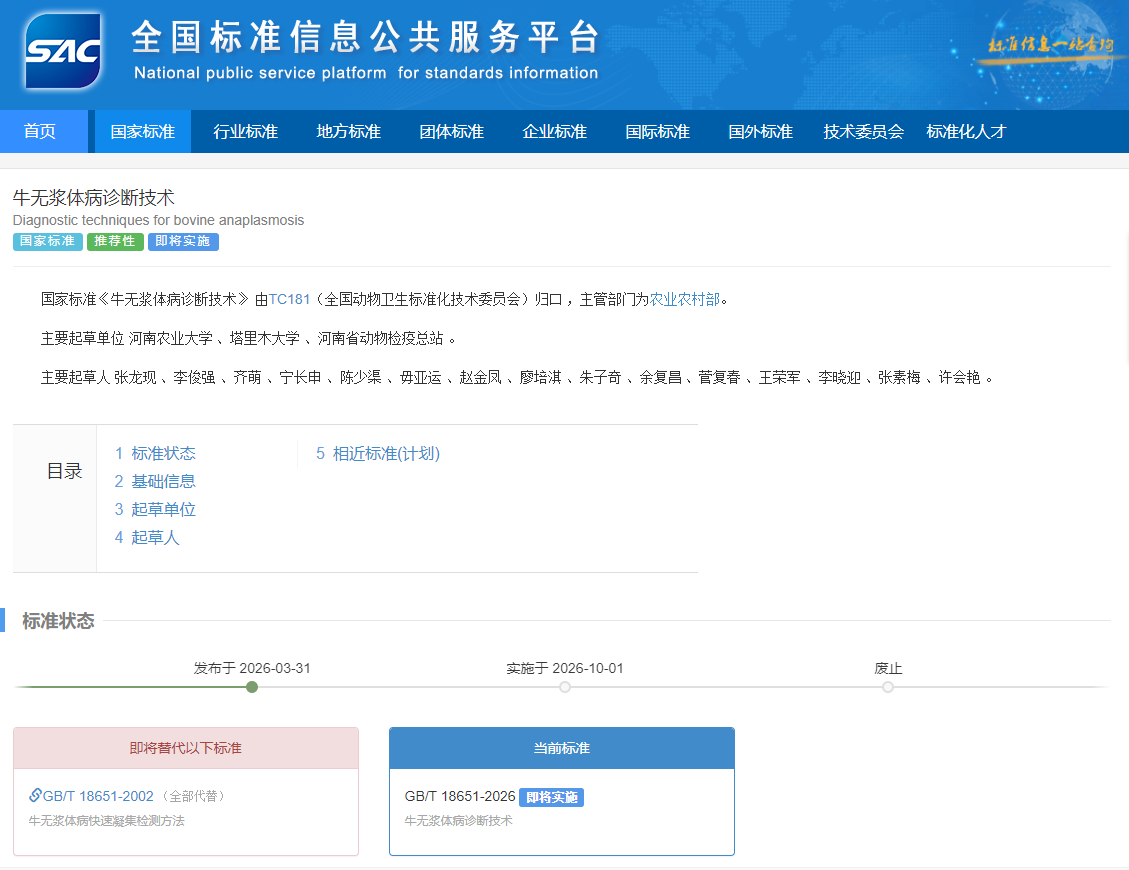 近日,从国家市场监督管理总局(国家标准化委员会)2026年第15号公告,以及全国标准信息公共服务平台获悉,由我张龙现教授牵头,联合塔里木大学和河南省动物检疫总站,共同修订的国家标准《牛无浆体病诊断技术》(GB/T 18651-2026)于2026年3月31日正式发布,将替代GB/T 18651-2002,于2026年10月1日起正式实施。该标准的制定工作在2023年度十四五国家重点研发计划项目“畜禽寄生虫病防控技术研发与应用”(项目编号2023YFD1801200)和河南省重点研发专项“动物源重要人兽共患病源头防控措施与关键技术创新”231111111500支持下完成,修订了牛无浆体病诊断诊断领域的国家标准体系,为该病科学防控提供权威技术支撑。