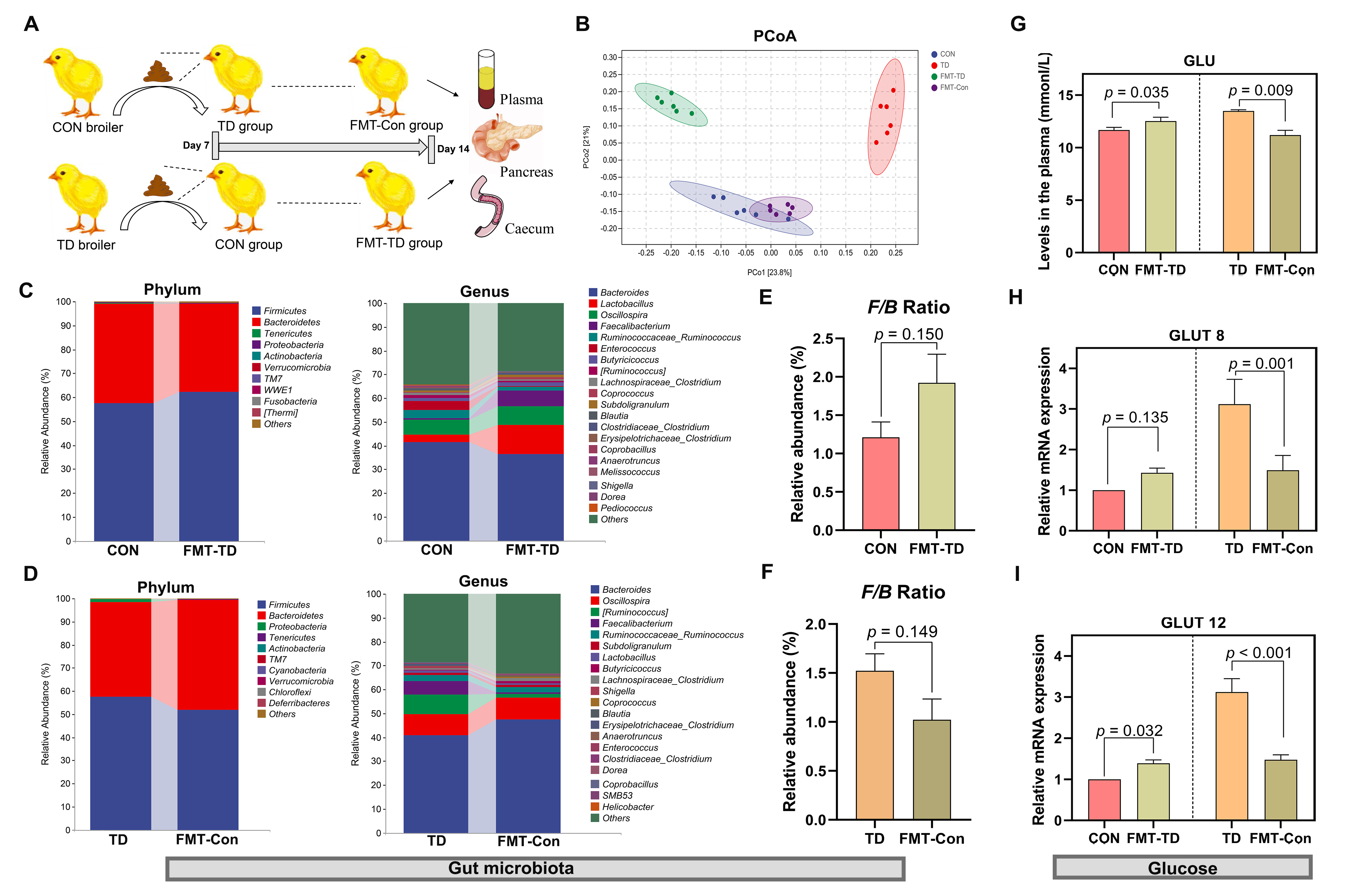 肠道菌群紊乱和高血糖水平是骨病的两个易感因素。我们团队先前的研究发现TD肉鸡不仅肠道菌群发生紊乱(Huang et al., Front Physiol, 2022),而且血糖水平普遍升高(Livest Sci, 2020; 233:103956)。然而,肠道菌群介导的糖代谢对肉鸡胫骨软骨发育不良的作用机制仍不清楚。通过构建TD肉鸡模型,我们注意到TD肉鸡的血糖水平升高,同时伴随着胰腺结构、胰腺分泌功能的改变以及肠道屏障功能的损坏。重要的是,来自正常肉鸡的粪便微生物菌群通过移植可以恢复TD肉鸡肠道菌群并抑制血糖的升高,这些发现证实了肠道菌群失调介导的高血糖可能参与TD肉鸡的骨稳态调节(图1)。