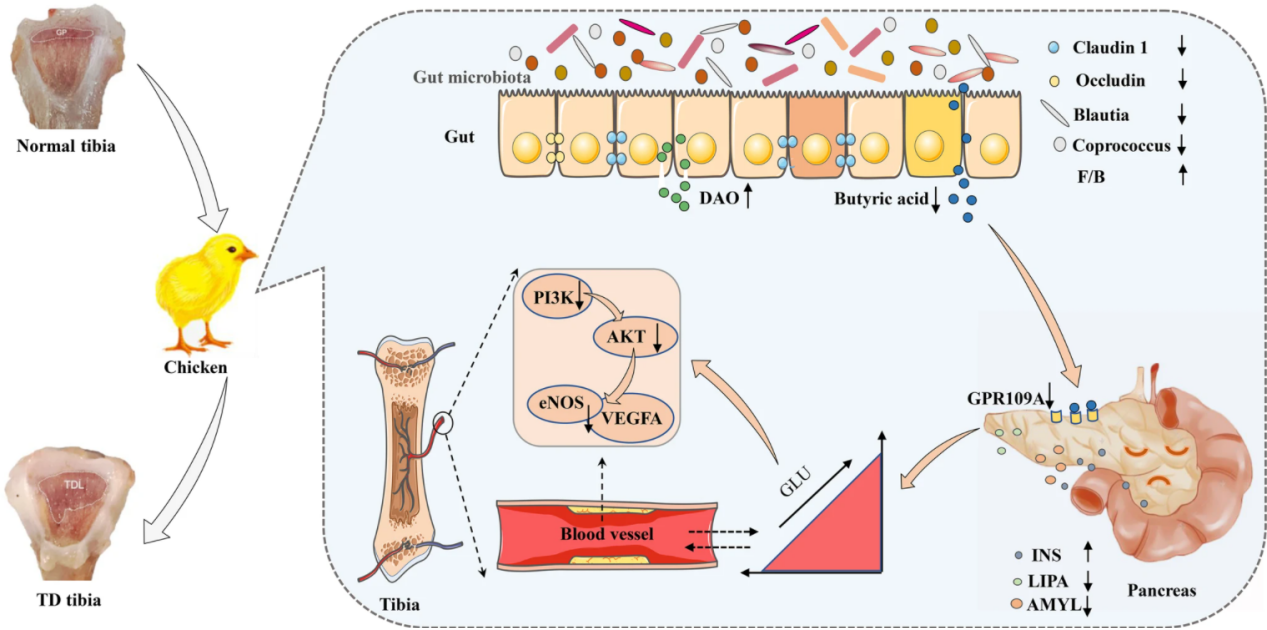 多组学测序分析显示,肠道菌群中Blautia和Coprococcus的代谢产物丁酸通过作用于胰腺中的GPR109A受体来调节葡萄糖稳态。葡萄糖代谢紊乱抑制了胫骨生长板上PI3K/AKT/VEGFA信号通路的表达,从而加剧胫骨软骨发育不良的病变。此外,益骨中草药提取物骨碎补总黄酮处理TD肉鸡进一步验证了通过调节肠道菌群和改善肠道和胰腺功能能够降低TD肉鸡的血糖水平,从而改善TD肉鸡的胫骨生长状况(图2)。